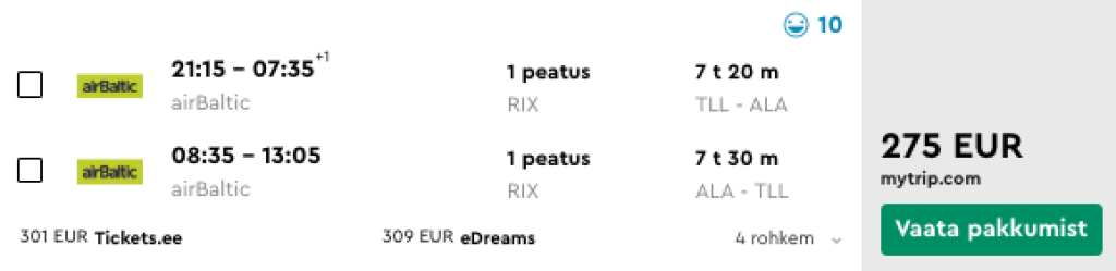 airBaltic pakub hetkel soodsa hinnaga lennupileteid suveks Tallinnast Kasahstani. Edasi-tagasi lennupiletite hinnad Tallinnast Almatõsse on saadaval alates 275€ eest ning soodsa hinnaga lennupileteid leidub alates aprilli algusest kuni oktoobri lõpuni. Parima hinnaga lennupiletid leiad üles meie poolt välja toodud näidiskuupäevade valikust või otsides ise läbi Momondo.ee