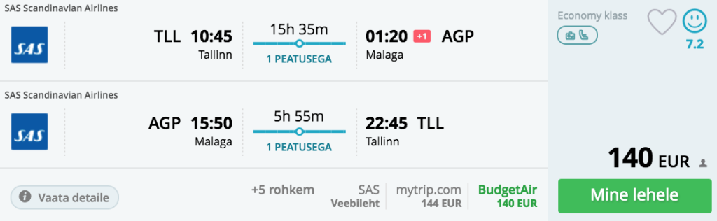 SAS pakub hetkel hea hinnaga lennupileteid suvel Tallinnast Malagasse. Edasi-tagasi lennupiletid on saadaval alates 140€ eest. Pakkumise konks on selles, et minnes tuleb teha pikem ümberistumine kas Stockholmis (10h) või Kopenhaagenis (13h). Tagasilend on kiire. Kuna ümberistumine toimub päeval siis selline pikem ümberistumine annab võimaluse külastamaks ka emb-kumba linna. Saadavust leiab augustis ja septembris.