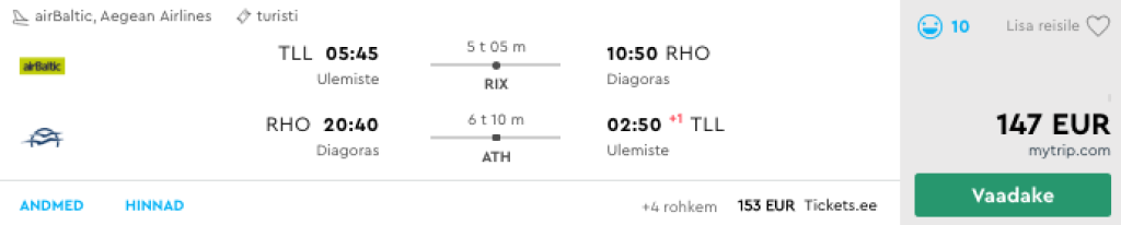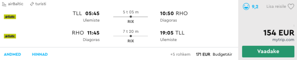 Leidsime üles väga hea hinnaga lennupiletid suveks Tallinnast Rhodosele. Nimelt pakub airBaltic edasi-tagasi lennupileteid Tallinnast Rhodosele alates 154€ eest. Veelgi soodsamad piletid leian osadel kuupäevadel tehes tagasilend Aegeaniga ja siis maksavad edasi-tagasi lennupiletid vaid 147€. Saadavust leiab juulist kuni oktoobri alguseni välja. Kõikidel meie poolt välja otsitud lennukuupäevadel on mõlemal suunal üks kiire ümberistumine Riias ja tagasiteel vahel ka Ateenas.