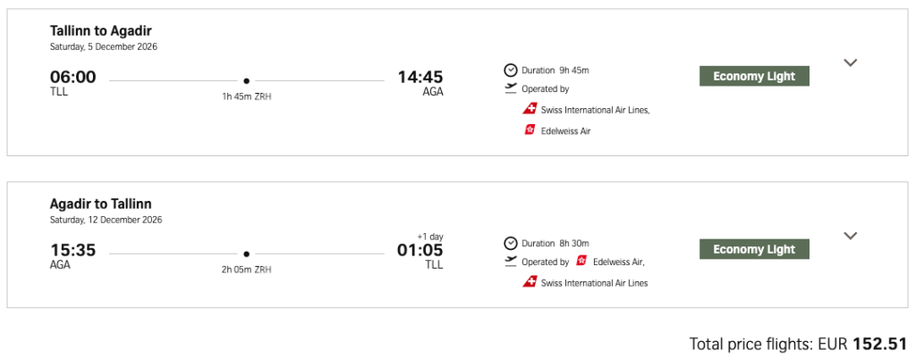 SWISS pakub hetkel suurepärase hinnaga lennupileteid Atlandi ookeani äärsesse Marokosse. Edasi-tagasi lennupiletid Tallinnast Agadiri on saadaval alates 153€ eest