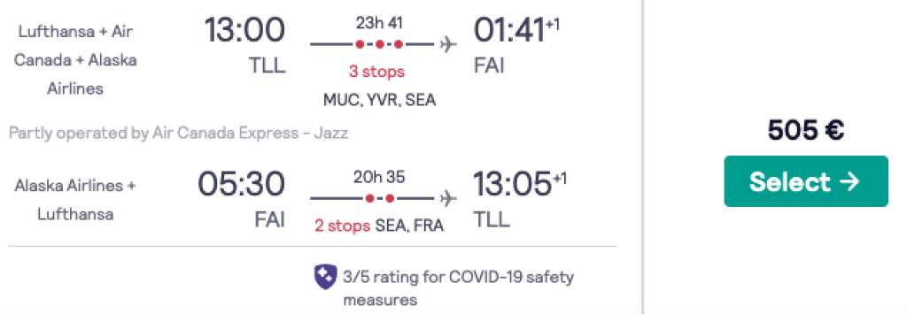 Lufthansa koostöös partnerlennufirmadega pakuvad hetkel väga hea hinnaga lennupileteid Tallinnast Alaskale. Soodsaimad edasi-tagasi lennupiletid Anchoragesse ning Fairbanksi on saadaval alates 449€ eest ning saadavust leiab kuni 2021 septembrini. Väga hea hinnaga (550-660€) lennupiletid leiab ka suveks. Lennupiletite hinna sees on ka äraantav pagas. Toome allpool vaid näidiskuupäevad, saadavust leiab ka teistel kuupäevadel. Parima hinnaga lennupiletid leiad üles läbi Skyscanneri