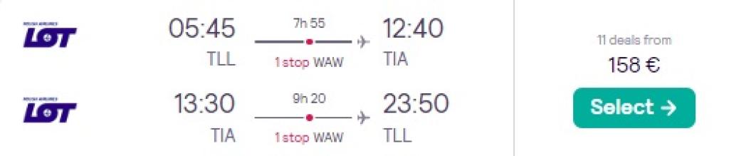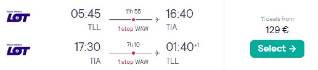LOT pakub käimasoleva kampaania raames soodsa hinnaga lennupileteid Albaaniasse. Edasi-tagasi lennupiletid Tallinnast Tiranasse on hetkel saadaval alates 129€ eest ja soodsa hinnaga lennupileteid leidub märsist juunini. Toome allpool välja vaid mõned näidiskuupäevad, parima hinnaga lennupiletid leiab läbi Skyscanneri. Kui soovid piletid osta otse lennufirmalt, siis mine LOT.com ja sisesta kuupäevad otsingusse.