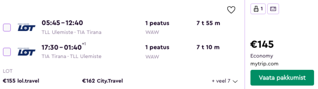 LOT pakub hetkel väga hea hinnaga lennupileteid Albaaniasse. Edasi-tagasi lennupiletid Tallinnast Tiranasse on saadaval alates 145€ eest ja soodsa hinnaga lennupileteid leidub kevadeks. Toome allpool välja vaid mõned näidiskuupäevad, parima hinnaga lennupiletid leiab läbi Momondo.ee. Kui soovid piletid osta otse lennufirmalt kuskil 10-15€ võrra kallimalt, siis mine LOT.com ja sisesta huvipakkuvad lennukuupäevad otsingusse.