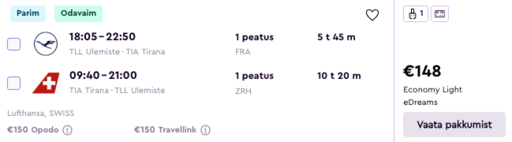 Lufthansa ja SWISS pakuvad hetkel väga hea hinnaga lennupileteid Albaaniasse. Edasi-tagasi lennupiletid Tallinnast Tiranasse on saadaval alates 148€ eest. Saadaval on väga hea valik soodsaid lennukuupäevi oktoobrist kuni tuleva aasta kevadeni välja. Lendudel on ümberistumised Frankfurdis, Zürichis või Münchenis. Endale sobivaid lennukuupäevi kontrolli läbi Momondo.ee