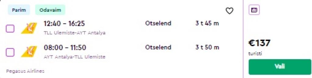 Pegasus ning Sunexpress pakuvad hetkel suurepärase hinnaga lennupileteid Vahemere äärde, Türgi Rivierasse. Edasi-tagasi otselennud Tallinnast Antalyasse on saadaval alates 137€ eest. Soodsa hinnaga lennupileteid leiab suure valikuga päikseliseks puhkusreisiks alates märtsist kuni maini.