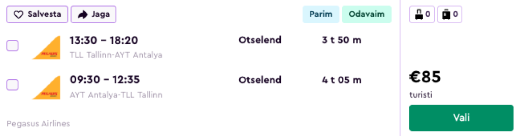 Pegasus pakub hetkel suurepärase hinnaga lennupileteid Türgi Rivierasse. Edasi-tagasi lennupiletid otselendudele Tallinnast Antalyasse on saadaval alates 85€ eest.