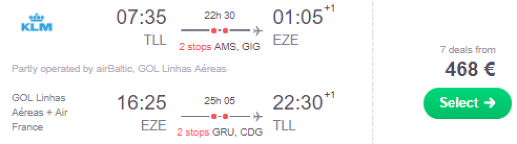 Skyteami lennufirmad KLM/AF pakuvad hetkel väga hea hinnaga lennupileteid Tallinnast Argentiinasse. Edasi-tagasi lennupiletid Tallinnast Buenos Airesesse on saadaval alates 468€ eest. KLMi lendude puhul on soodsaima hinna sees vaid käsipagas (kuni 12kg). Piletiteni jõudmiseks kliki allpool olevatel näidiskuupäevadel või kontrolli endale sobivaid lennukuupäevi läbi skyscanneri.