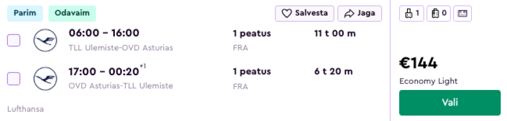 Lufthansa pakub hetkel väga hea hinnaga lennupileteid lendudele Astuuriasse. Ühe ümberistumisega edasi-tagasi lennupiletid Tallinnast Oviedo lennujaama (asub Biskaia lahe äärse Avilesi linna lähedal) on saadaval alates 144€ eest ja ümberistumised toimuvad Frankfurdis või Münchenis.