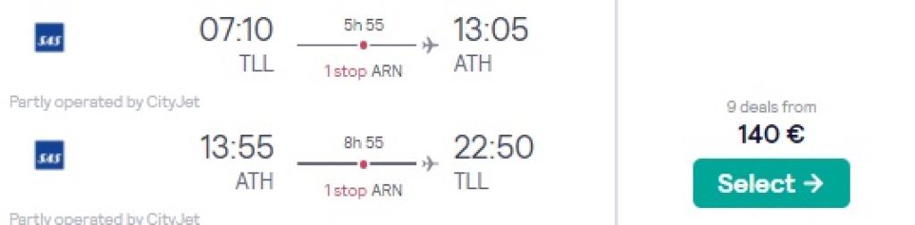 Erinevad Star Alliance'i lennufirmad pakuvad hetkel väga hea hinnaga lennupileteid Kreekasse. Edasi-tagasi lennupiletid Tallinnast Ateenasse leiab üles alates 140€ eest ja saadaval on soodsaid lennukuupäevi augustist novembrini. Lendudel on mõlemal suunal üks ümberistumine. Parima hinnaga lennupiletid leiad üles läbi Skyscanneri. Või kliki allolevatel näidiskuupäevadel.