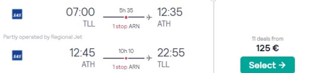 SAS pakub hetkel soodsa hinnaga lennupileteid Kreekasse. Edasi-tagasi lennupiletid Tallinnast Ateenasse leiab üles alates 125€ eest ja saadaval on soodsaid lennukuupäevi septembrist novembrini. Lendudel on mõlemal suunal üks ümberistumine. Parima hinnaga lennupiletid leiad üles läbi Skyscanneri. Või kliki allolevatel näidiskuupäevadel.