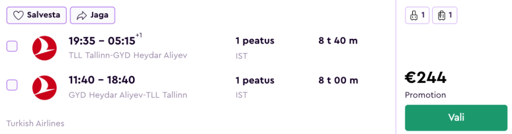 Turkish Airlines pakub hetkel soodsa hinnaga lennupileteid Aserbaidžaani. Edasi-tagasi lennupiletid Tallinnast Bakuusse on saadaval alates 244€ eest. Kõikidel meie poolt välja otsitud näidiskuupäevadel on mõlemal suunal üks kiire ümberistumine Istanbulis.