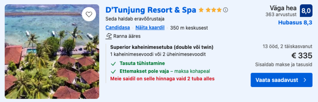 Toome allpool välja ka näite, kuidas saab ise broneerides kahenädalase puhkuse Balil kätte vaid 929€ eest (reisides kahekesi). Hinnas sisalduvad Lufthansa lennupiletid Tallinnast (pagas hinnas) ning merevaatega tuba rannaäärses 4* hotellis (13 ööd).