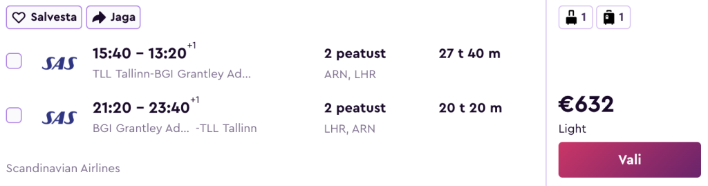 Virgin Atlantic koostöös SASiga pakuvad hetkel suurepärase hinnaga lennupileteid Barbadosele. Soodsaimad edasi-tagasi lennupiletid Tallinnast on saadaval alates 632€ eest. Miinuseks on minnes pikem ümberistumine Londonis, mis annab ka võimaluse selle linnaga tutvumiseks.