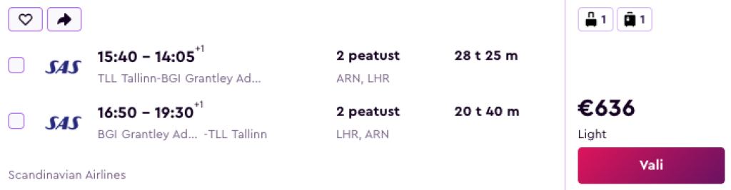 Virgin Atlantic koostöös SASiga pakuvad hetkel suurepärase hinnaga lennupileteid Barbadosele. Soodsaimad edasi-tagasi lennupiletid Tallinnast on saadaval alates 636€ eest. Miinuseks on minnes pikem ümberistumine Londonis, mis annab ka võimaluse selle linnaga tutvumiseks.