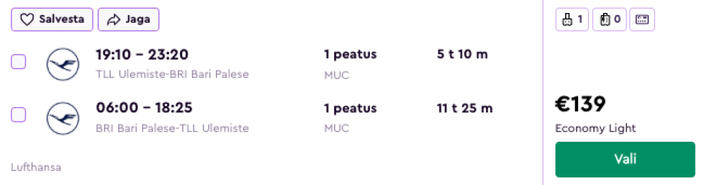 Lufthansa koostöös SWISSiga pakuvad hea hinnaga lennupileteid Apuuliasse. Edasi-tagasi lennupiletid Tallinnast Barisse on hetkel saadaval alates 139€ eest. Lendudel on mõlemal suunal üks ümberistumine Münchenis, Zürichis või Frankfurdis.