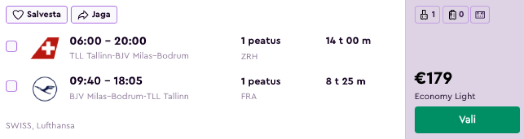 Lufthansa koostöös SWISSiga pakuvad hetkel väga hea hinnaga lennupileteid Türki. Edasi-tagasi lennupiletid Tallinnast Bodrumi on saadaval alates 179€ eest. Miinuseks on osadel kuupäevadel päevasel ajal pikem ümberistumine kas siis Frankfurdis või Zürichis, mis annab ka võimaluse emb-kumb linnaga tutvumiseks.