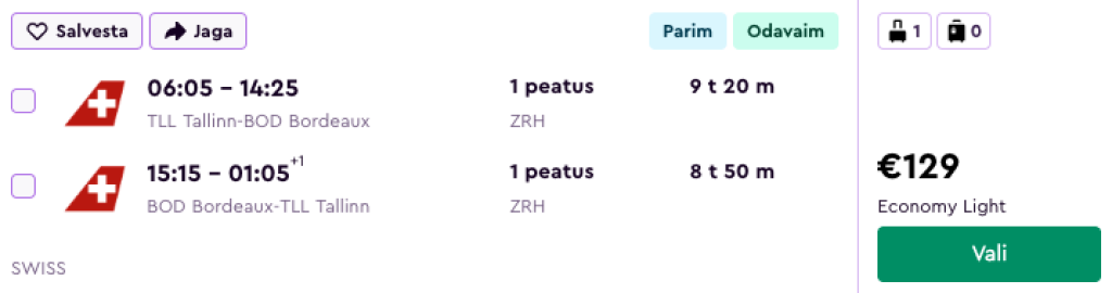 SWISS koostöös Lufthansaga pakuvad hetkel väga hea hinnaga lennupileteid Prantsusmaale. Kiirete ümberistumistega edasi-tagasi lennupiletid Tallinnast Bordeaux'sse on saadaval alates 129€ eest.
