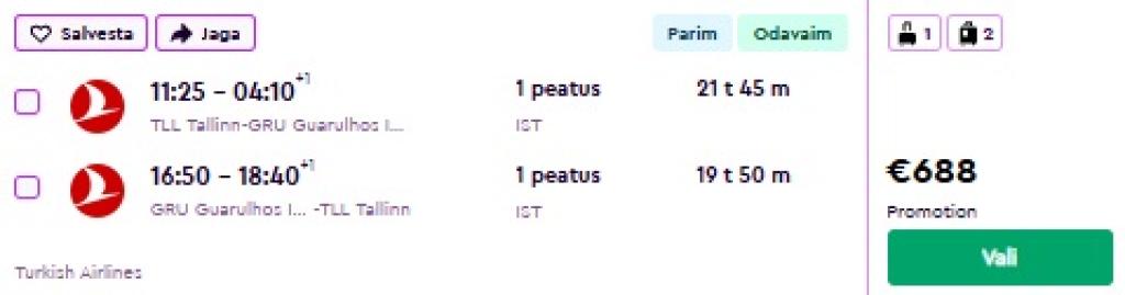 Turkish Airlines pakub hetkel hea hinnaga lennupileteid Brasiiliasse. Edasi-tagasi lennupiletid Tallinnast Sao Paulosse on saadaval alates 688€ eest ja kõikidel meie poolt otsitud näidiskuupäevadel on üks kiire ümberistumine Istanbulis.