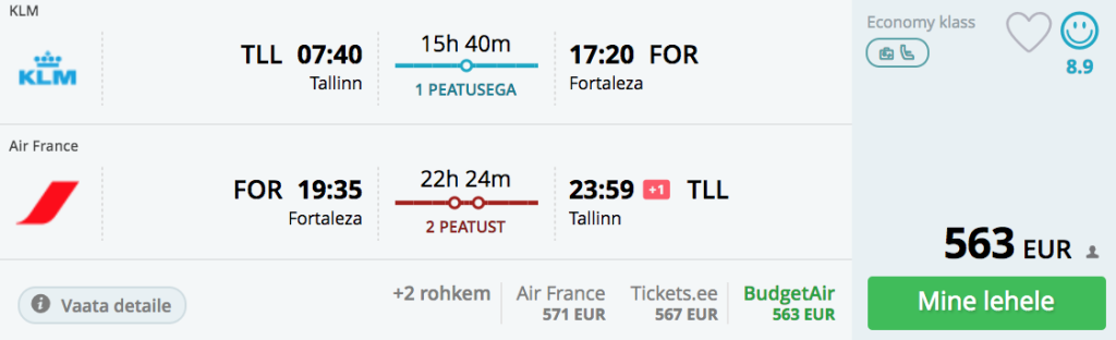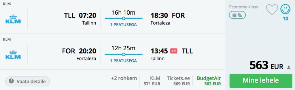 KLM koostöös Air France ning airBalticuga pakuvad hetkel hea hinnaga lennupileteid talveks Brasiilasse. Edasi-tagasi lennupiletid Tallinnast Fortalezasse on saadaval alates 563€ eest. Olenevalt lennukuupäevadest on 1-2 ümberistumist nii Amsterdamis/Pariisis kui ka vahel Riias. Piletiteni jõudmiseks kliki näidiskuupäevadel allpool või kontrolli endale sobivaid lennukuupäevi läbi Momondo.ee