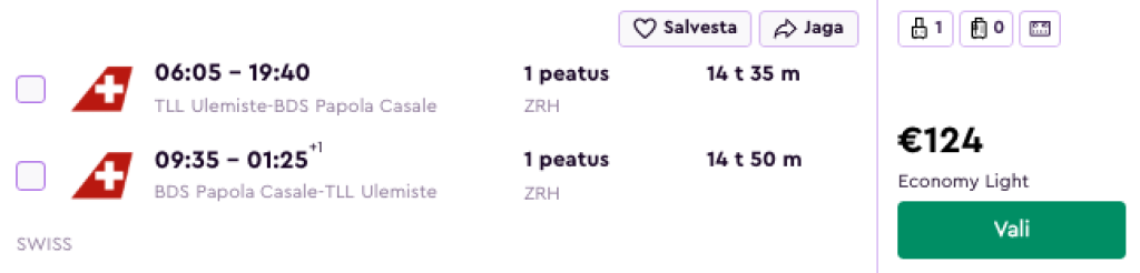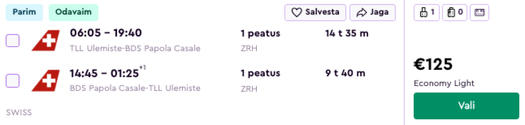 SWISS koostöös Lufthansaga pakuvad hetkel suurepärase hinnaga lennupileteid Apuuliasse. Edasi-tagasi lennupiletid Tallinnast Brindisisse on saadaval alates 124€ eest ning lendudel on mõlemal suunal üks ümberistumine. Osadel kuupäevadel on päevasel ajal pikemad ümberistumised, mis annavad ka võimaluse Zürichiga tutvumiseks.