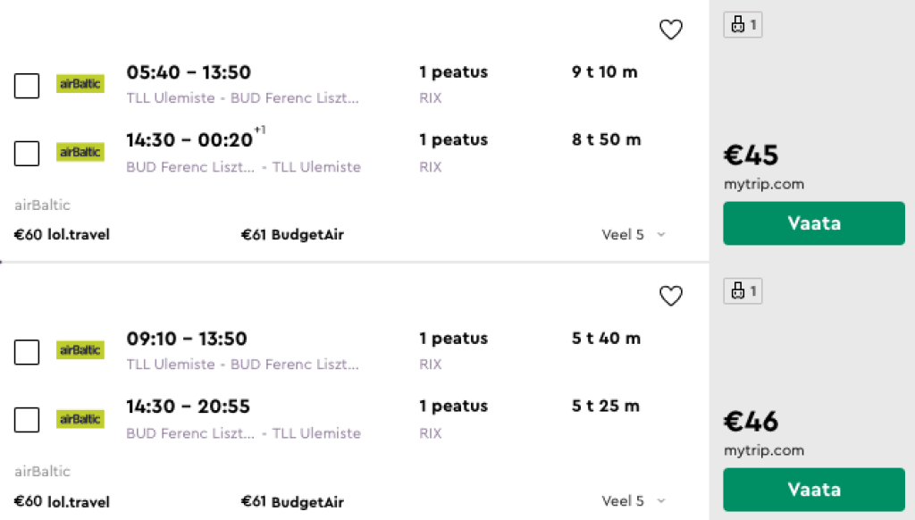 airBaltic pakub hetkel käimasoleva müügikampaania raames väga hea hinnaga lennupileteid Tallinnast Ungarisse. Ühe kiire ümberistumisega edasi-tagasi lennupiletid Tallinnast Budapesti on saadaval alates 45€ eest ning soodsa hinnaga lennupiletite saadavust leiab suveks. AirBalticu lennud Riia ja Budapesti vahel toimuvad 2x nädalas T ja L seega leidub variante veetmaks Budapestis pikk nädalavahetus (L-T). Parima hinnaga lennupiletid leiad üles läbi Momondo, aga meie soovitus on minna airBaltic.com ja soetada lennupiletid otse lennufirmalt (66€).