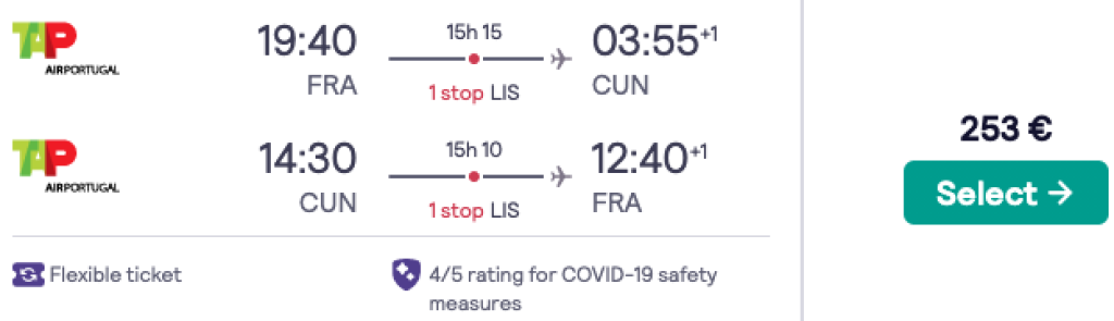 TAP Portugal pakub hetkel erakordselt soodsa hinnaga lennupileteid erinevatest Euroopa linnadest Cancuni. Toome välja variandi kus lennupiletid marsruudil Tallinn-Frankfurt-Cancun on saadaval alates 354€ eest. Soodsa hinnaga lennupileteid Cancuni leiab ka näiteks Madriidist, Berliinist, Amsterdamist ja Milaanost (juba alates märtsi lõpust!). Frankfurdist lennates leiab soodsa hinnaga lennupileteid mais-juunis.Parima hinnaga lennupiletid leiad üles läbi Skyscanneri