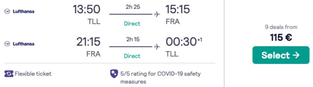 Lennupiletite ostmiseks tuleb soetada eraldi nii lennupiletid Tallinnast Frankfurti kui Frankfurdist Cancuni. Toome allpool välja näidiskuupäevad lendamaks Frankfurdist Cancuni. Sobivad lennupiletid Tallinnast Frankfurti leiad üles samuti läbi Skyscanneri. Näide - 16.04-01.05