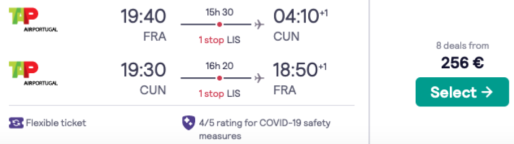 TAP Portugal pakub hetkel erakordselt soodsa hinnaga lennupileteid erinevatest Euroopa linnadest Mehhikosse, Cancuni. Toome välja variandi, kus lennupiletid marsruudil Tallinn-Frankfurt-Cancun on saadaval alates 371€ eest. Soodsa hinnaga lennupileteid TAP Portugaliga Cancuni leiab lisaks Frankfurdile ka näiteks Madriidist, Barcelonast ja Amsterdamist. Frankfurdist lennates leiab soodsa hinnaga lennupileteid alates aprillist kuni juunini ning uuesti alates augusti lõpust kuni novembri keskpaigani. Parima hinnaga lennupiletid leiad üles läbi Skyscanneri