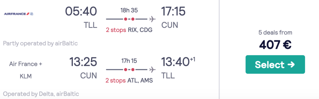 KLM ja Air France koostöös teiste Skyteami lennufirmadega pakuvad hetkel väga hea hinnaga lennupileteid Tallinnast Mehhikosse. Edasi-tagasi lennupiletid Yukatani poolsaarel asuvasse Cancuni on saadaval alates 398€ eest ning saadavust leiab alates jaanuarist kuni maini välja. Toome allpool välja vaid mõned näidiskuupäevad, saadavust on ka teistel kuupäevadel! Parima hinnaga lennupiletid leiad üles läbi Skyscanneri