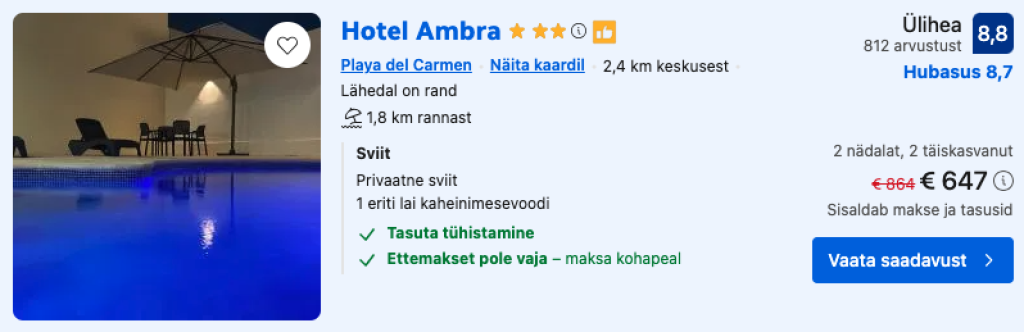 Toome ka välja näite, kuidas saab ise broneerides kahenädalase sügisreisi Mehhikosse kätte vaid 948€ eest (reisides kahekesi). Hinnas sisalduvad Air Canada lennupiletid algusega Tallinnast ning privaatne sviit Playa del Carmenis (14 ööd).
