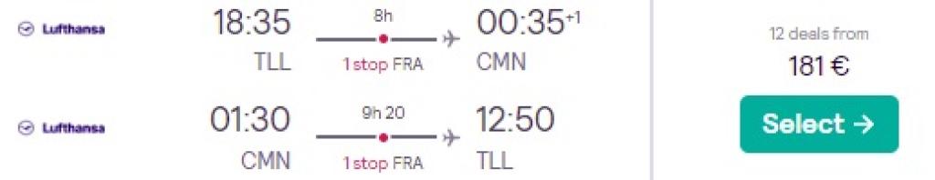 Lufthansa pakub hetkel hea hinnaga lennupileteid Marokosse. Edasi-tagasi lennupiletid Tallinnast Casablancasse on saadaval alates 181€ eest ning hea hinnaga lennupileteid leiab suvepikenduseks septembris-oktoobris. Soodsaimad lennupiletid leiab üles läbi Skyscanneri, aga kui soovid osta lennupiletid otse lennufirma kodulehelt, siis sisesta endale sobivad kuupäevad otse Lufthansa.com.