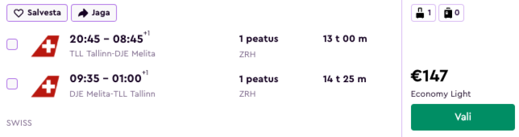Lufthansa koostöös SWISSiga pakuvad hetkel väga hea hinnaga lennupileteid Tuneesiasse. Edasi-tagasi lennupiletid Tallinnast Djerba saarele on saadaval alates 147 eest. Miinuseks on tulenevalt lennuplaanist tihtipeale pikemad ümberistumised kas siis Zürichis või Frankfurdis.