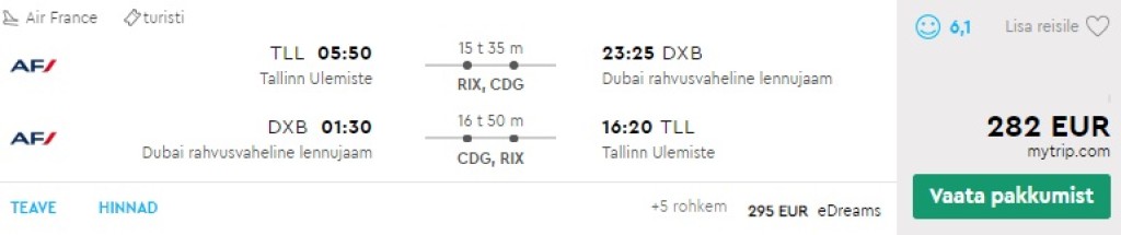 KLM/Air France pakuvad hetkel hea hinnaga lennupileteid Tallinnast Dubaisse. Edasi-tagasi lennupiletid leiab üles alates 282€ eest ning soodsa hinnaga lennukuupäevi leidub oktoobrist märtsini. Lennupiletite ostmiseks kliki allpool olevatel näidiskuupäevadel või otsi endale sobivad lennupiletid üles läbi Momondo.ee