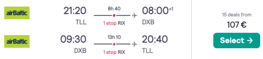 airBaltic pakub hetkel erakordselt soodsa hinnaga lennupileteid Dubaisse. Ühe ümberistumisega edasi-tagasi lennupiletid Tallinnast on saadaval alates 107€(!!!) eest ning lennupiletite saadavus on alates veebruarist kuni 2023 aasta oktoobrini välja. Alates maist on sellise hinnaga lennupileteid saadaval peaaaegu et kõikidele lendudele! Toome allpool välja vaid mõned näidiskuupäevad, saadavust leiab ka teisteks kuupäevadeks. Parima hinnaga lennupiletid leiad üles läbi Skyscanneri, aga meie soovitus on minna airBaltic.com ja soetada lennupiletid otse lennufirmalt vaid mõnevõrra kallimalt (hinnad alates 154€).