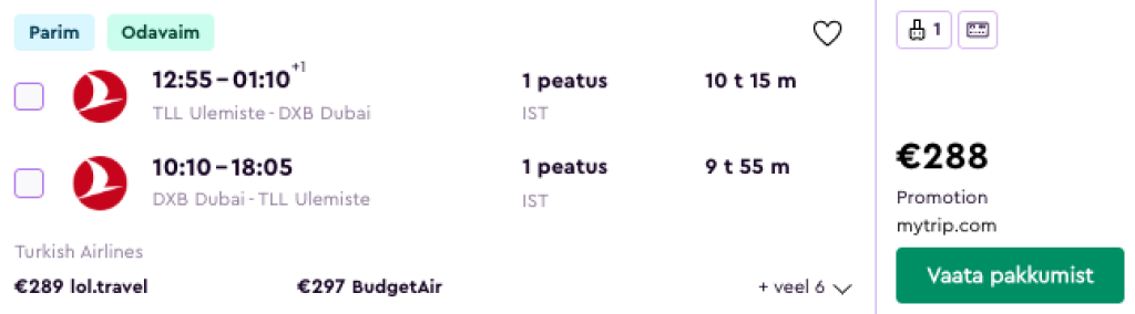 Turkish Airlines pakub hetkel suurepärase hinnaga lennupileteid Araabia Ühendemiraatidesse. Edasi-tagasi lennupiletid Tallinnast Dubaisse on saadaval alates 288€ eest. Soodsa hinnaga ning ühe kiire ümberistumisega lennupiletid leiab reisimaks vahemikus november-aprill. Lennupiletite hinnas sisaldub ka äraantav pagas! Lennupiletiteni jõudmiseks kliki allpool välja toodud kuupäevadel või otsi endale sobivad lennupiletid üles läbi Momondo.ee