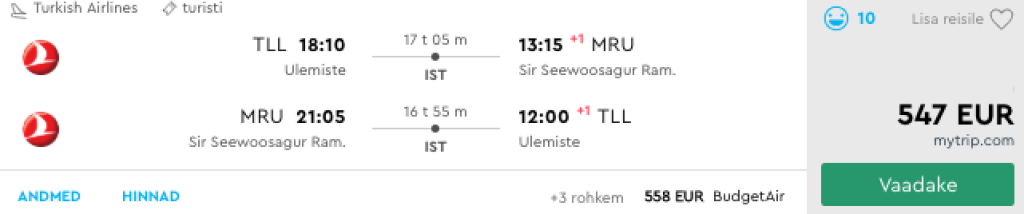 Lennufirma Turkish Airlines pakub väga hea hinnaga lennupileteid Tallinnast Mauritiuse saarele. Hea valiku soodsa hinnaga lennupileteid leiab alates märtsist kuni juunini ja septembrist kuni oktoobri lõpuni. Edasi-tagasi lennupiletid on saadaval alates 547€ eest. Lennud on ühe kiire ümberistumisega Istanbulis ning hinna sees on nii äraantav pagas kui ka toitlustamine pardal.