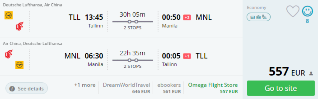 Hetkel on saada väga hea hinnaga lennupiletid Tallinnast Filipiinidele, Manilasse hinnaga al 557€. Lennufirmad Lufthansa+ Air China ning saadavus on septembrist detsembri lõpuni! Lennud kahe ümberistumisega mõlemal suunal. Minnes reeglina pikem (13h) peatus Pekingis, mida saab hõlpsasti kasutada linnaga tutvumiseks (ööbimine pole vajalik!). Saabudes Pekingi lennujaama saab seal vormistada 72h kehtiva tasuta transiitviisa! Lennupileteid leiad läbi momondo või kasuta otselinke allpool