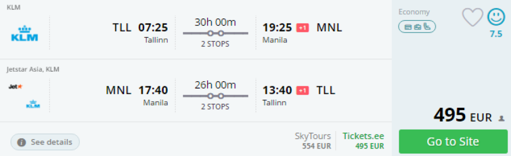 Hetkel leiad soodsa hinnaga lennupileteid sügiseks- talveks Tallinnast Filipiinidele! Edasi- tagasi lennupiletid saadaval hinnaga al 495€. Hea saadavus novembrist kuni veebruarini. Mõningate lennukuupäevade puhul toimub minnes pikem peatus Amsterdamis, mis on suurepärane võimalus linnaga tutvumiseks (väljaotsitud näidiskuupäevad ei eelda ühtegi ööbimist lennusegmentide vahel).
