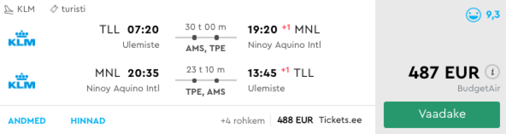 KLM ning Qatar Airways pakuvad hetkel hea hinnaga lennupileteid Filipiinidele. Edasi-tagasi lennupiletid Tallinnast Manilasse on saadaval alates 487€ eest. KLMi puhul on saadavus teatud kuupäevadel novembris-detsembris. Tallinnast lennates toimub minnes reeglina pikem ümberistumine Amsterdamis, mida saab suurepäraselt kasutada Amsterdamiga tutvumiseks ja kuna ümberistumine on päevasel ajal siis ööbimine ei ole vajalik. Qatar Airwaysi lennupileteid leiab tunduvalt rohkematel kuupäevadel alates oktoobrist kuni aprilli lõpuni välja. Soodsad lennupiletid leiad üles allolevate otselinkide kaudu või kontrollides endale sobivaid kuupäevi läbi Momondo.ee