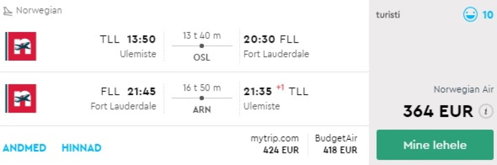 Norwegian pakub hetkel soodsat võimalust sügisel ja talvel Florida külastamiseks. Edasi-tagasi lennupiletid Tallinnast Fort Lauderdale'i on saadaval alates 364€ eest. Lennud on ühe ümberistumisega Stockholmis. Soodsate lennupiletite saadavust leiab vahemikus november-veebruar. Tutvu näidiskuupäevadega allpool või kontrolli endale sobivaid läbi Momondo.ee
