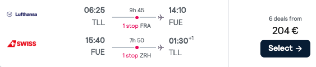 Lufthansa ja SWISS pakuvad hetkel suurepärase hinnaga lennupileteid Kanaaridele. Edasi-tagasi mugavad lennupiletid Tallinnast Fuerteventurale on saadaval alates 204€ eest.