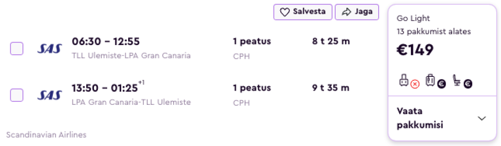 SAS pakub hetkel suurepärase hinnaga lennupileteid Kanaaridele. Kiirete ümberistumistega edasi-tagasi lennupiletid Tallinnast Gran Canariale on saadaval alates 149€ eest.