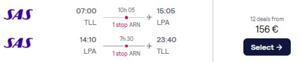 SAS pakub hetkel suurepärase hinnaga lennupileteid Kanaaridele. Kiirete ümberistumistega edasi-tagasi lennupiletid Tallinnast Gran Canariale on saadaval alates 156€ eest.