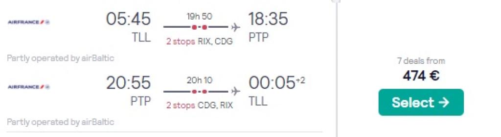 KLM/AF pakuvad hetkel väga hea hinnaga lennupileteid Kariibidele. Edasi-tagasi lennupiletid Tallinnast Guadeloupele on saadaval alates 474€ eest ning saadavus on septembrist detsembrini. Lendudel on mõlemal suunal üks või kaks ümberistumist. Soodsate lennupiletiteni jõudmiseks kliki allolevatel näidiskuupäevadel või sisesta endale sobivad lennukuupäevad Skyscannerisse. Kui soovid osta piletid otse lennufirmalt, siis sisesta soovitud lennukuupäevad KLM'i kodulehele.