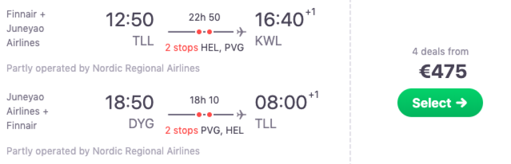 Finnair ja Juneyao Airlines pakuvad hetkel väga hea hinnaga lennupileteid Tallinnast Hiinas asuvasse Guilini linna. Edasi-tagasi lennupiletid on saadaval alates 476€ eest ja lennupiletite hinna sees on nii toitlustamine lennufirmade pardal kui äraantav pagas. Saadavust leiab septembriks ja oktoobriks, mis on väga hea aeg selle piirkonna külastamiseks. Parima hinnaga lennupiletid leiad üles läbi Skyscanneri või klikkides allolevatel näidiskuupäevadel. Tõime allpool välja ka huvitava open-jaw variandi kus saad alustada reisi Guilinist ning teha tagasilennu teisest väga huvitava loodusega piirkonnast, Zhangjiajiest.