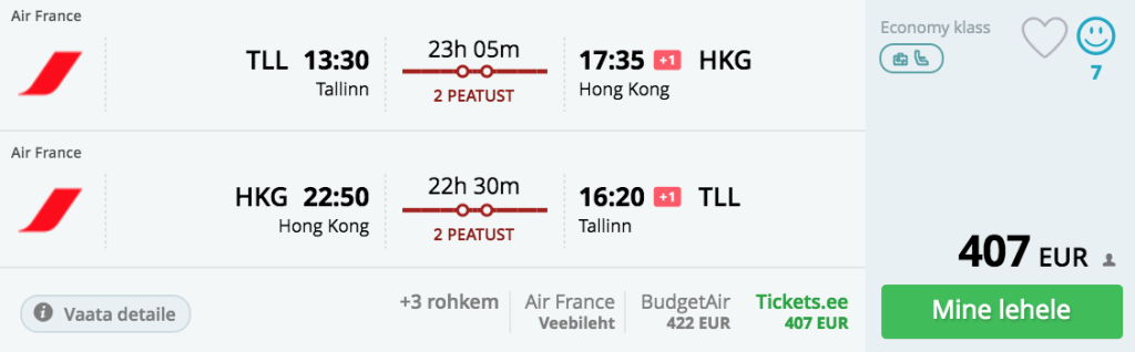 Air France ning KLM koostöös airBalticuga pakuvad hetkel hea hinnaga lennupileteid Tallinnast Hongkongi. Edasi-tagasi lennupiletid Tallinnast Hongkongi on saadaval 391€ eest ning saadavust juba aprilli lõpust kuni sügiseni. Suvel on saadavus kehvem. Lendudel on enamjaolt kaks ümberistumist, Riias ning Pariisis või Amsterdamis.