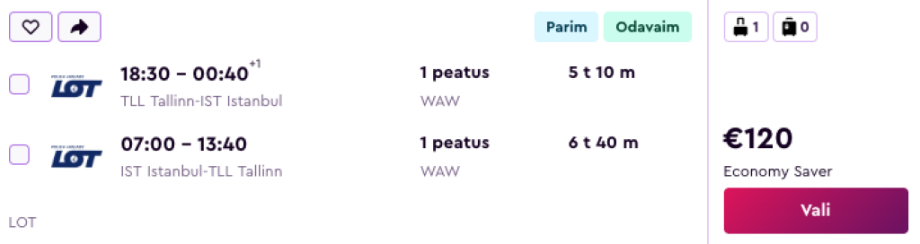 LOT Polish Airlines pakub hetkel väga hea hinnaga lennupileteid Tallinnast Istanbuli. Soodsaimad edasi-tagasi lennupiletid on saadaval alates 120€ eest. Kõikidel meie poolt välja otsitud lendudel on mõlemal suunal üks kiire ümberistumine Varssavis.