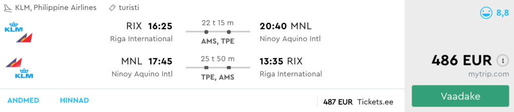 KLM koostöös airBalticu ning Philippine Airlinesiga pakuvad hetkel hea hinnaga lennupileteid Filipiinidele. Edasi-tagasi lennupiletid Tallinnast ja Riiast Filipiinide pealinna Manilasse on saadaval alates 483€ eest. Saadavus on teatud kuupäevadel sügisel. Tallinnast lennates toimub minnes reeglina pikem ümberistumine Amsterdamis, mida saab suurepäraselt kasutada Amsterdamiga tutvumiseks ja kuna ümberistumine on päevasel ajal siis ööbimine Amsterdamis ei ole vajalik. Soodsad lennupiletid leiad üles allolevate otselinkide kaudu või kontrollides endale sobivaid kuupäevi läbi Momondo.ee