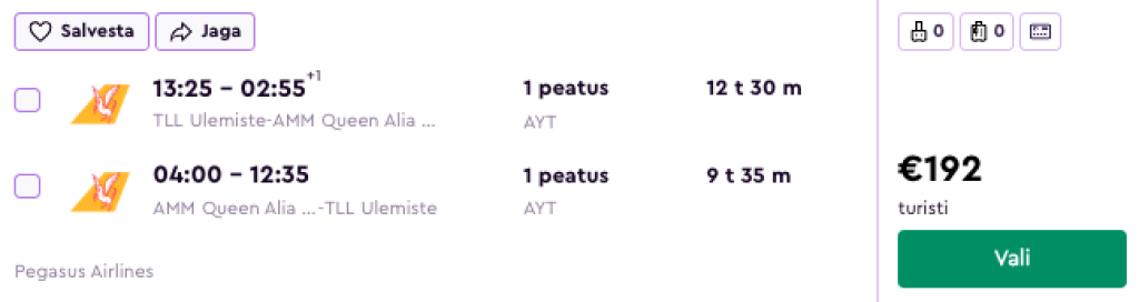 Pegasus pakub hetkel väga hea hinnaga lennupileteid Jordaaniasse. Soodsaimad edasi-tagasi lennupiletid Tallinnast Jordaania pealinna Ammanisse on saadaval 192€ eest ning saadavus on väga hea nii sügisel kui talvel. Lendudel on mõlemal suunal üks ümberistumine Antalyas.