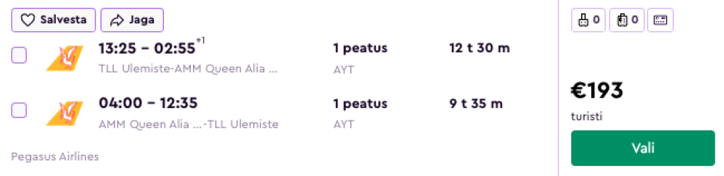 Pegasus pakub hetkel väga hea hinnaga lennupileteid Jordaaniasse. Soodsaimad edasi-tagasi lennupiletid Tallinnast Jordaania pealinna Ammanisse on saadaval 193€ eest ning saadavus on väga hea nii sügisel kui talvel. Lendudel on mõlemal suunal üks ümberistumine Antalyas.